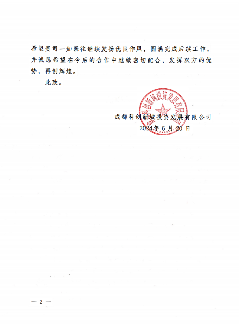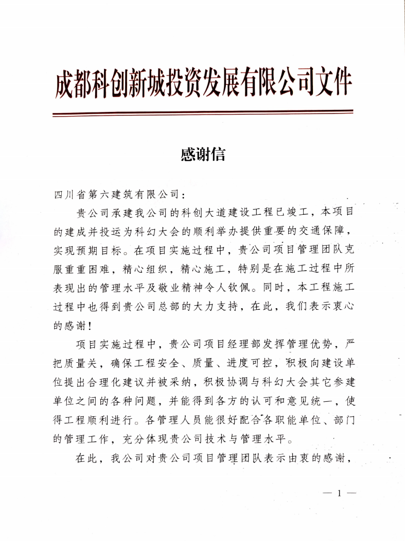 6月20日,公司收到一封來自成都科創(chuàng)新城投資發(fā)展有限公司(下稱:科創(chuàng)新城公司)的感謝信,對公司在科創(chuàng)大道建設(shè)工程項目建設(shè)過程中所付出的努力表達了感謝和肯定。